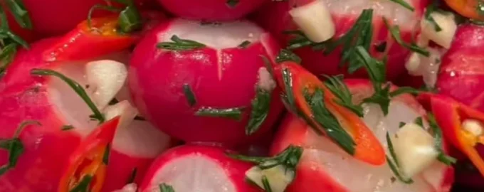 Eftersom det är säsong för hemgjorda rädisor är det en bra tid att lägga till denna tidiga vårgrönsak i din meny. En video av inlagda rädisor har blivit viral på sociala nätverk och många värdinnor har redan provat denna trend i sina kök. Matlagningsbloggaren Kristin Azizyan delade ett beprövat recept på inlagda rädisor. Det är snabbt och enkelt att tillaga och blir otroligt gott och smakrikt.