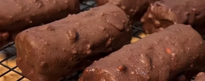 - Tillsätt därefter hackade nötter i chokladen och blanda. Trä upp cheesecaken på ett grillspett och glasera med choklad. Ställ in i kylskåpet i 10 minuter och du är klar.